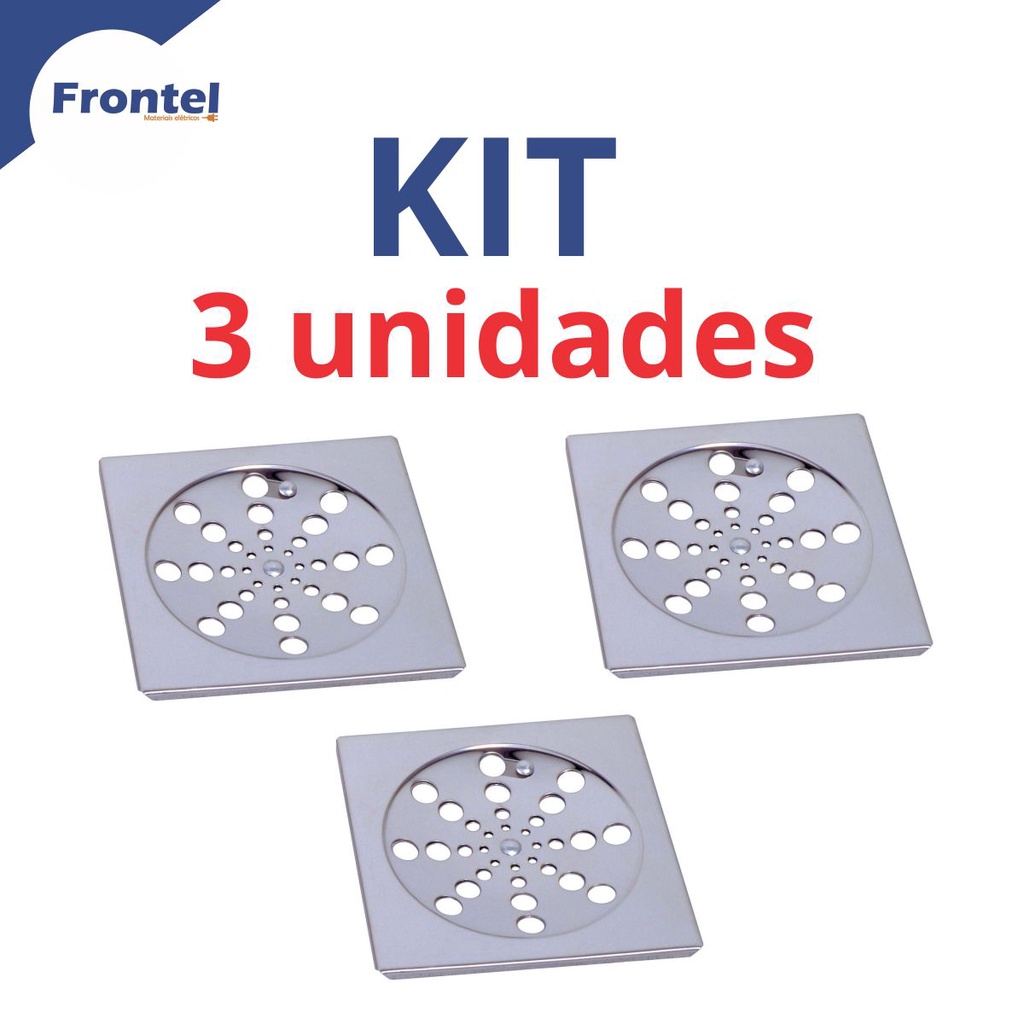 Kit com 3 Ralo Tampa Grelha Aço Inox Quadrado Abre e Fecha Rotativo 10 cm 100 mm banheiro quintal brilhante Quadrada