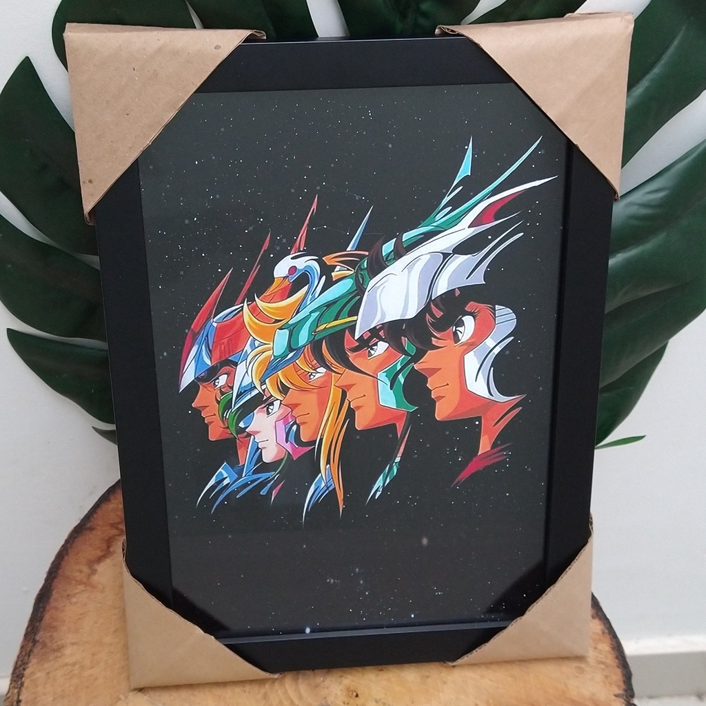 Quadro decorativo com moldura e vidro Os Cavaleiros do Zodíaco Seiya Shiryu Hyoga ikki Shun anime pôster geek