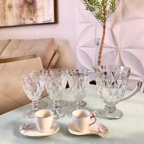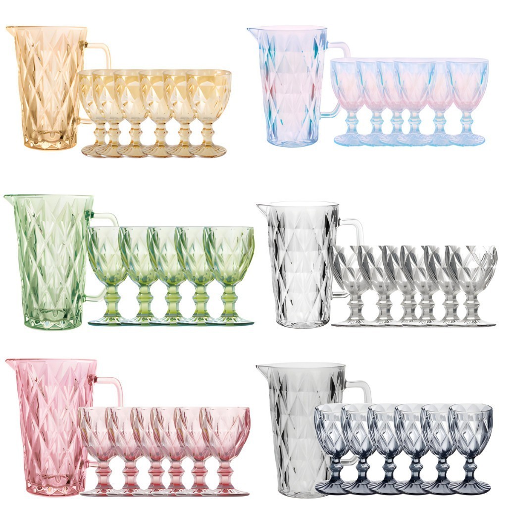 Jogo Com 6 Taças e Jarra de Vidro Diamante Bico Abacaxi Jaca Âmbar Preto Fosco Furta Cor Lilás Diamond Dourada Não Descasca Transparente