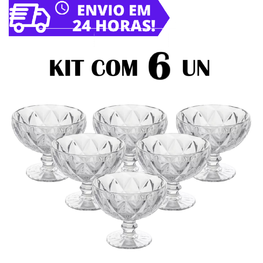 Jogo com 6 Taças Sobremesa Vidro Diamond Transparente 300ml Kit 6