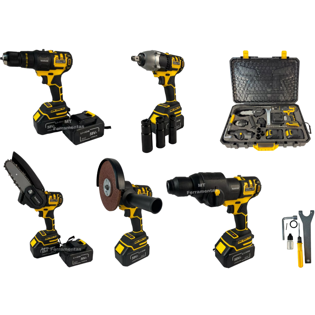 Kit Ferramentas 5 em 1 Furadeira Parafusadeira Motoserra Chave Impacto a Bateria 48V Completa Com Maleta