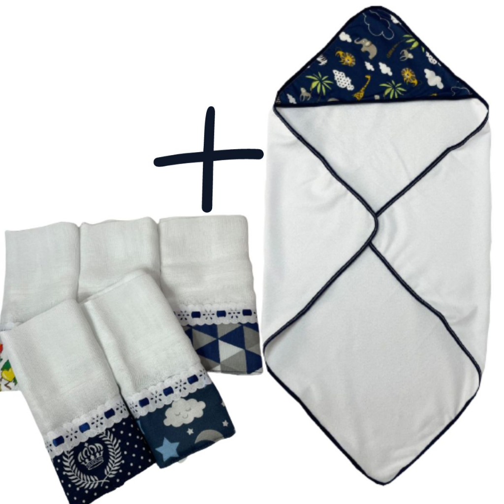 Kit Toalha de Banho Bebê Forrada com 5 Fraldinhas Babetes de Boca Algodão Enxoval Menino Personagem Safari Azul Marinho