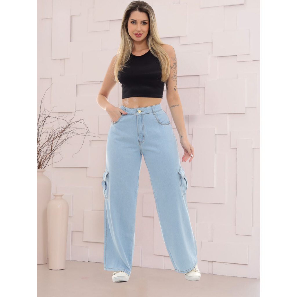 Calça Jeans Feminino Wide Leg Cargo Pantalona Boca Larga Jeans Original Premium 34 ao 44