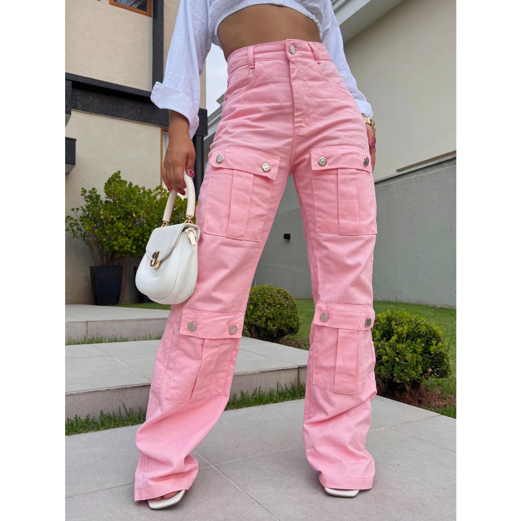 Calça Jeans Cargo FEMININA de mais bolso / wide leg /Colorida /Pantalona Feminina Moda Street Tecido Algodão Premium