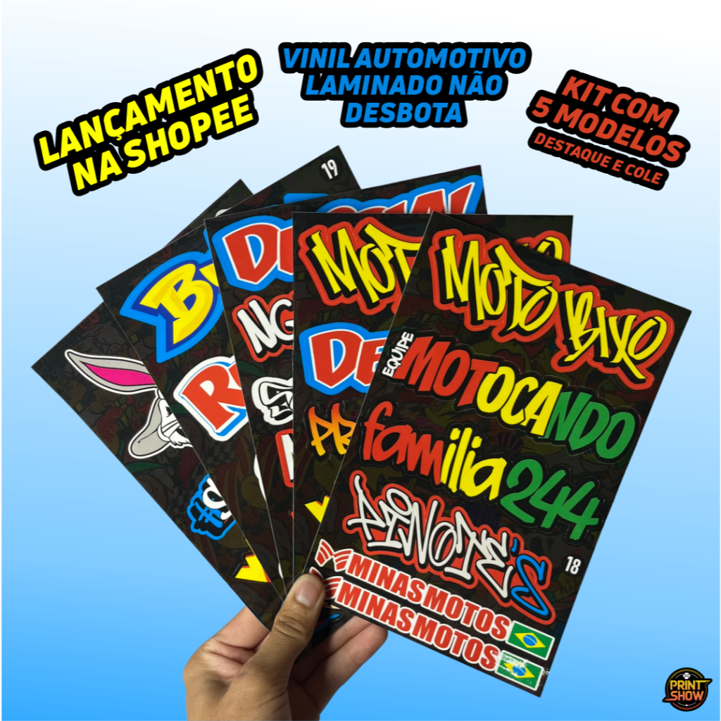 Kit 5 Cartelas Adesivos Vinil Laminado 22x15cm à Prova D’Água, Não Desbota e Alto Brilho Moto Carro Bike Capacete
