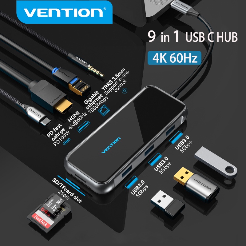 Venção 9 in1 USB HUB C Docking Station Tipo Para HDMI RJ45 USB3.0 TRRS3.5mm SD TF PD100W 1000 Mbps 4 K/60Hz PC Portátil Mac