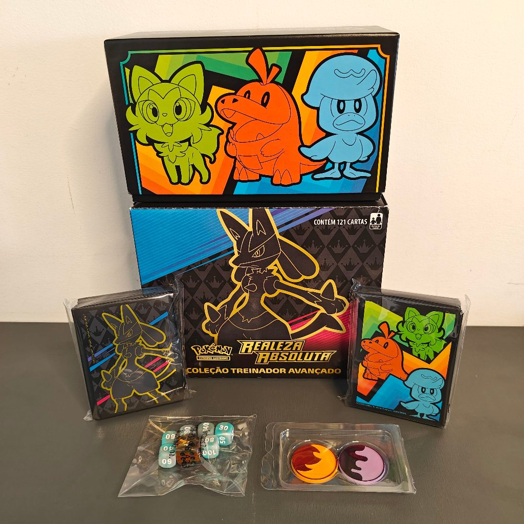 Itens de Box Pokemon ETB - Caixa Vazia, Sleeves, Dados, Marcadores - Coleção Treinador Avançado