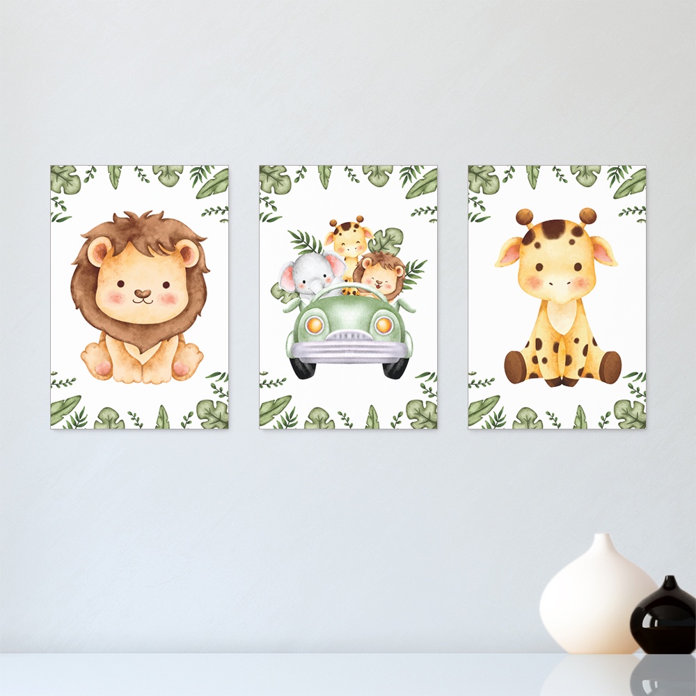 Kit 3 Quadros Decorativos Safari Aquarela Infantil Bebe Quarto Menino Menina Placas Decorativas - 0126ktpl