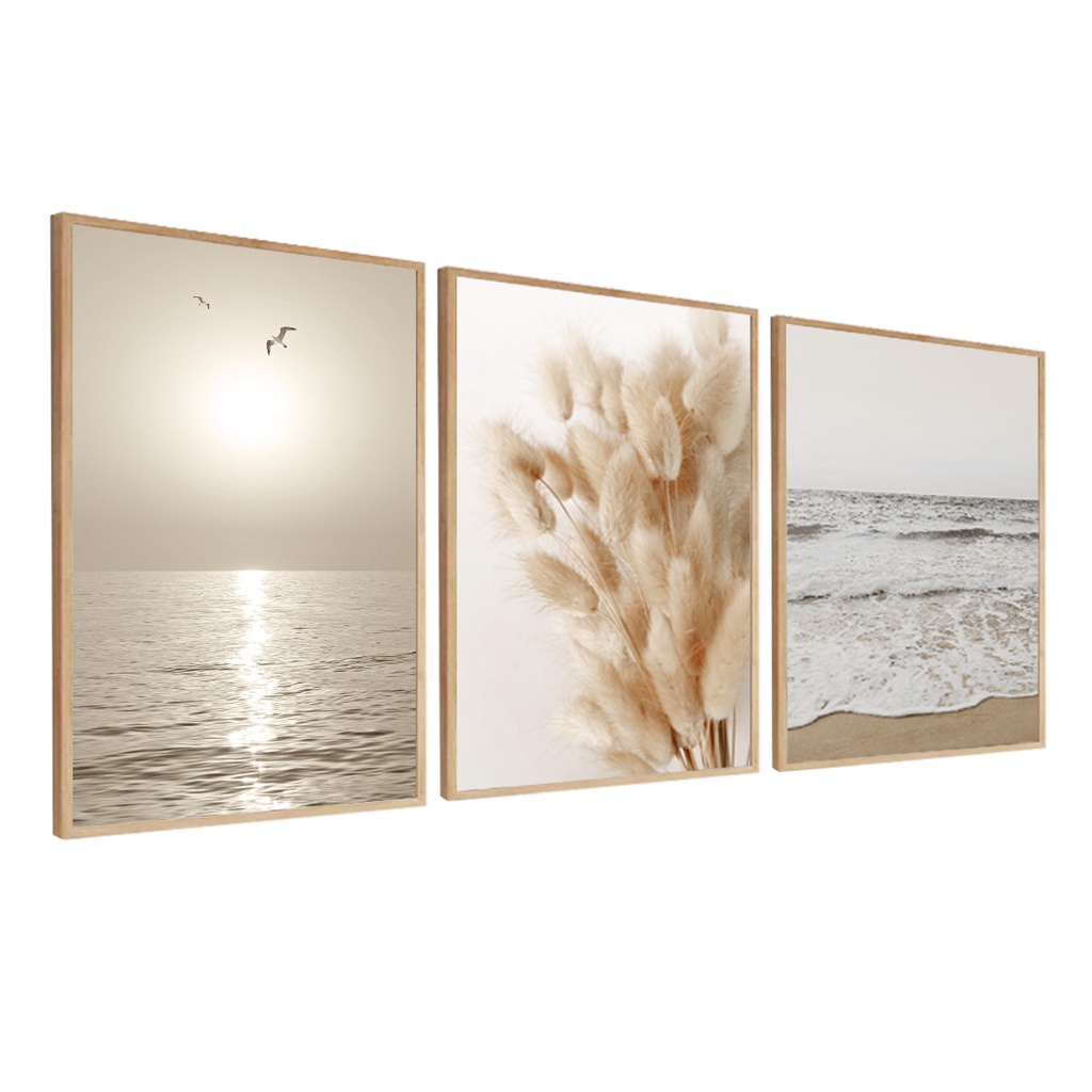 Kit 3 Quadros Decorativos Mar Capim dos Pampas Decoração Moderno Com Moldura