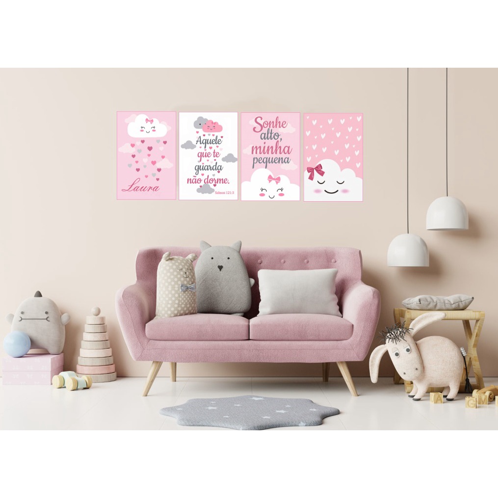 Kit 3 Quadros Decorativos Quarto Infantil menina, nuvem rosa, seja forte e corajosa, urso 20x30 Decoração