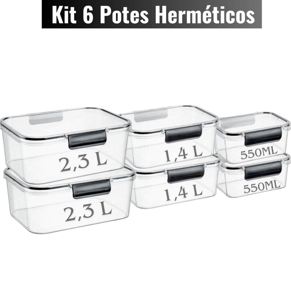 Kit 6 Potes Herméticos Retangular Marmita 2,3 Litros + 1,4 Litros + 550ml Alta Vedação Empilhável