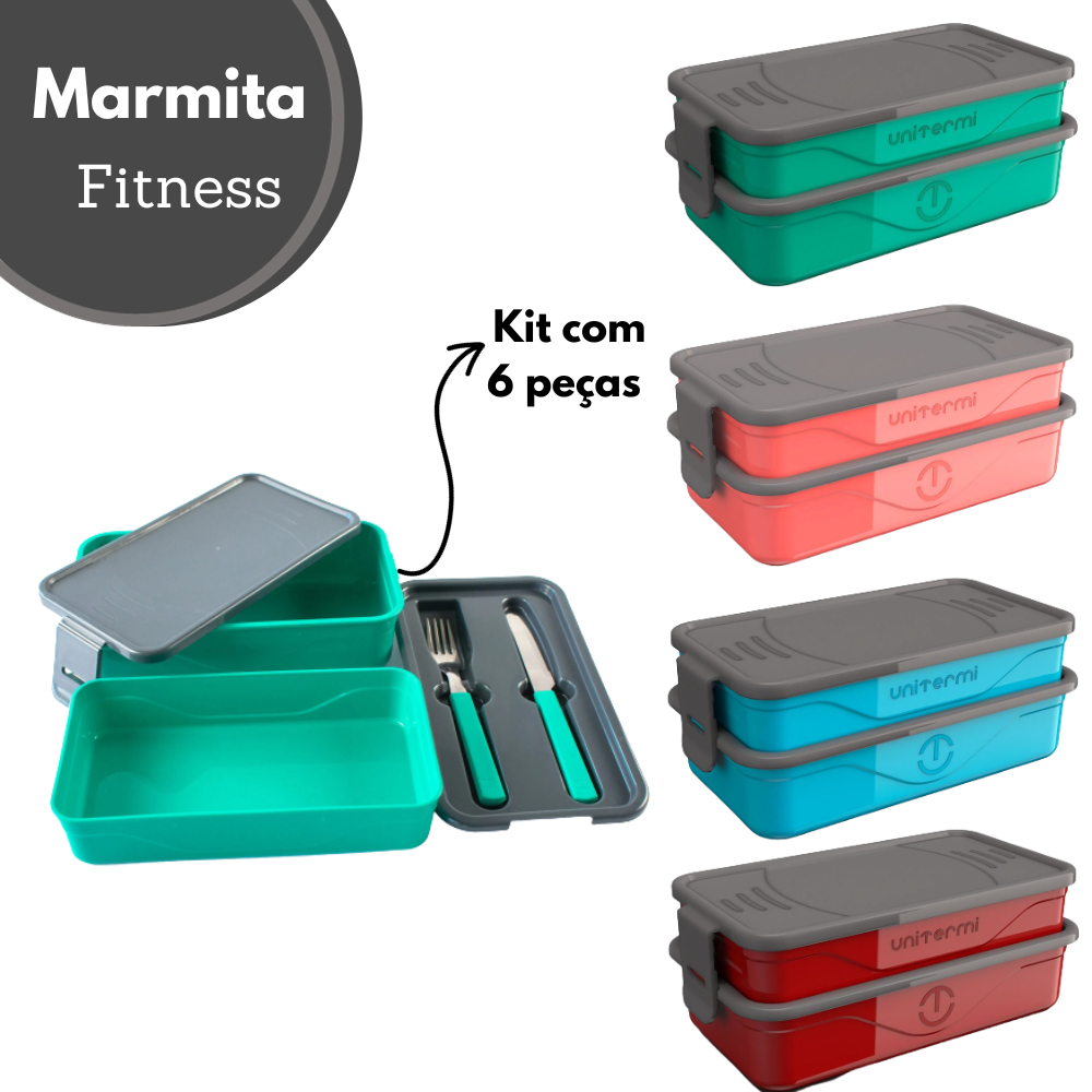 Kit 6 peças Marmita Fitness Bem Espaçosa 1,3 Litros Marmita com Divisórias com 2 Talheres Inox Unitermi