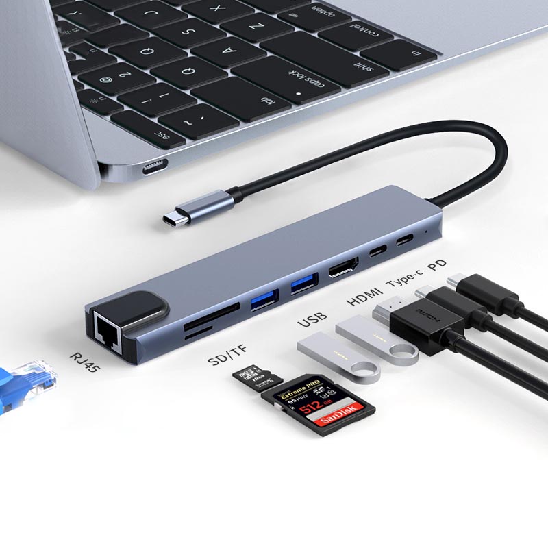 Hub Adaptador Tipo-c 8 Em 1 Hdmi 4k Usb 3.0 Para Laptop Adaptador PC Computador PD Carga 8 Portas Dock Station RJ45 HDMI TF/SD Card Notebook-Tipo Compatível MacBook/iPad Pro 2018/Dell XPS