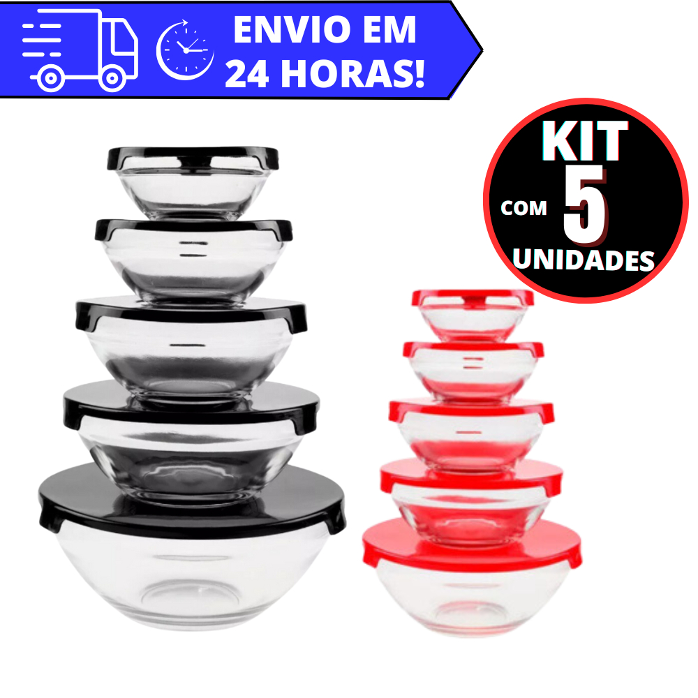 Conjunto Jogo Kit Potes Tigela Hermetico de Vidro com Tampa Marmita 5 Peças Porta Mantimentos Doces Papinhas