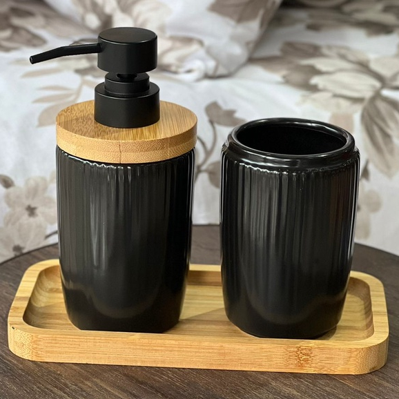Kit Banheiro Porcelana Porta Escova Sabonete Líquido Lavabo 2 Peças Preto Branco