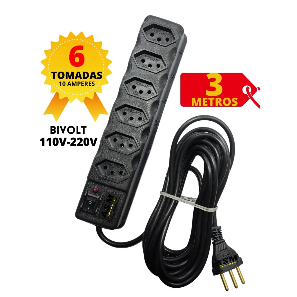 Filtro de Linha Régua 6, 5, 4 e 3 Tomadas Cabo 3 Metros de fio Fusível 110v-220v