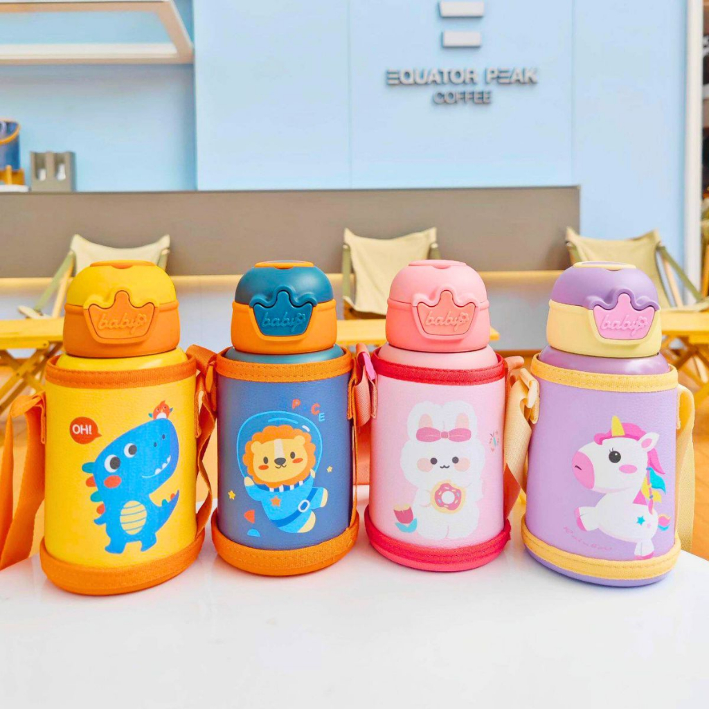 Garrafa Frasco Térmico Infantil com Bolsa Bico Silicone Aço Inox 316 Garrafinha de Água Térmica Bolsa Crianças Anti-Vazamento com Trava 480ml