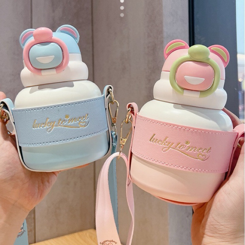 Garrafa Squeeze Termica Panda Animais Fofos Inox infantil e adulto Bico Silicone 350ml com Canudo+alca