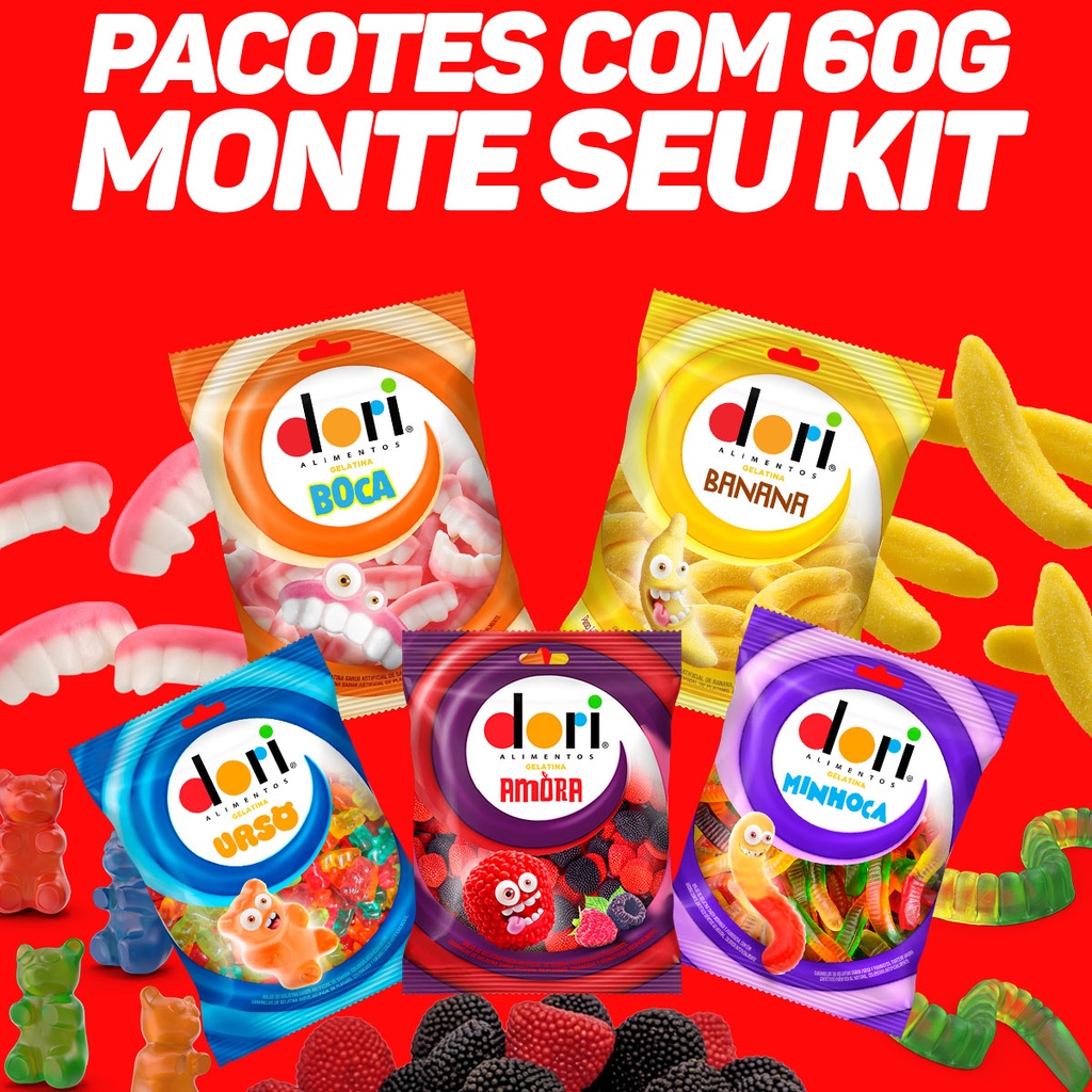 Bala De Gelatina Variedades De Sabores Dori - Doce 60g - Amora, Banana, Boca Sabor de Banana, Minhoca Sabor Framboesa e Morango e Urso Sabor de Banana