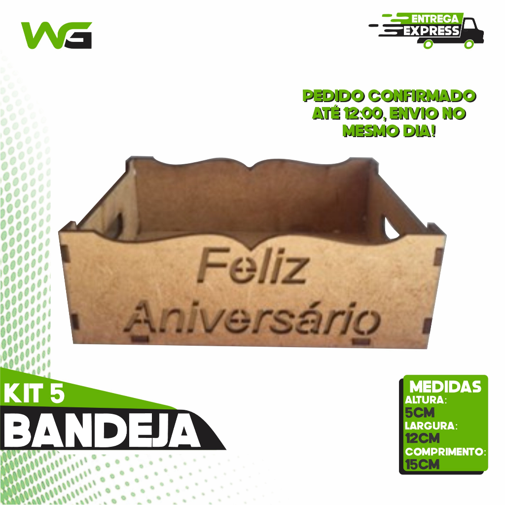 Kit 5 Bandeja P Feliz Aniversário MINI - Cesta / Caixa Em MDF cru 2.8MM - 10x15x5 CM / Lembrancinha - Decoração