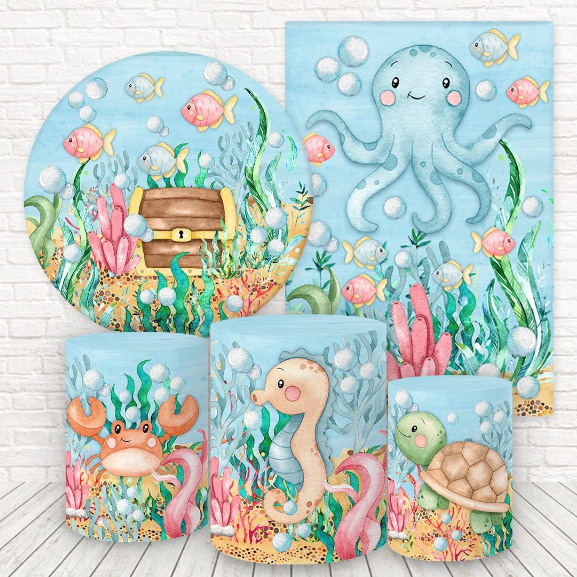 Kit 5 peças Capa Painel + Capa Retangular + Trio Cilindros para Festa Tema Fundo do Mar