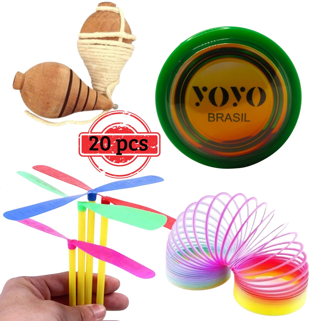 Kit Com 20 Brinquedos infantis (infantil) Yoyo com Eixo de Madeira Mola Maluca Pião de madeira e Girocoptero Ideal Para Aniversários e Festas