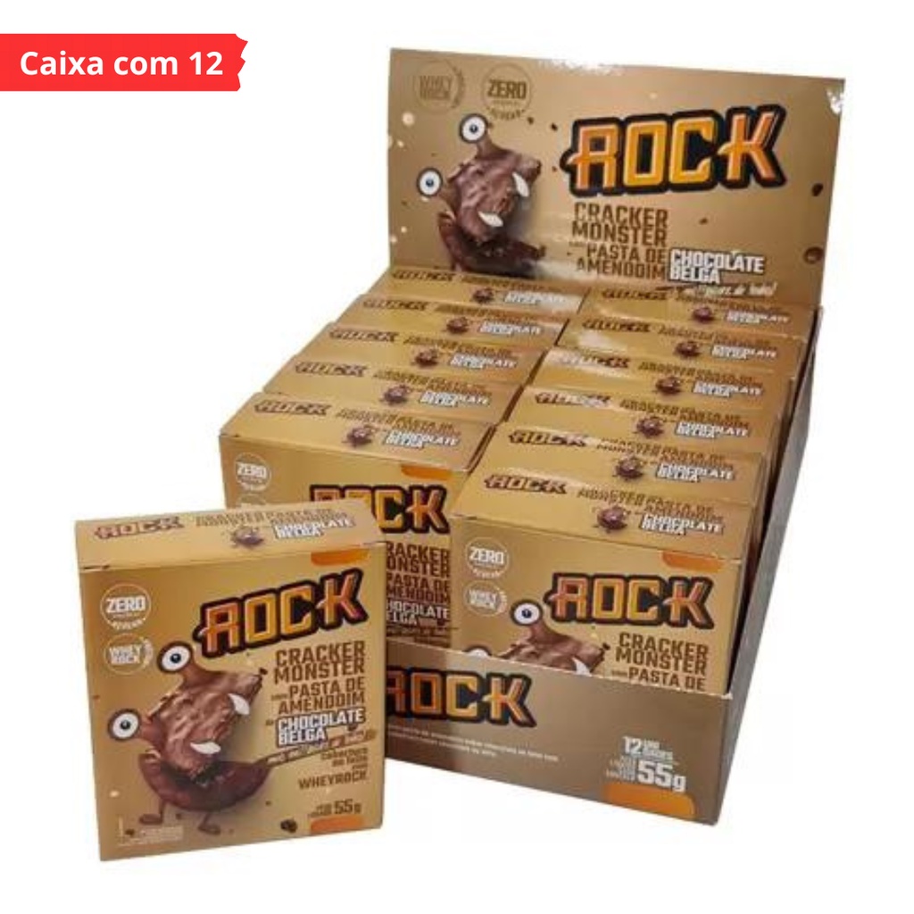 Caixa com 12 Unidades Biscoito Proteico Chocolate Belga Rock Cracker Monster 55g s/ Açúcar c/ Whey Rock Maravilhoso Alfajor