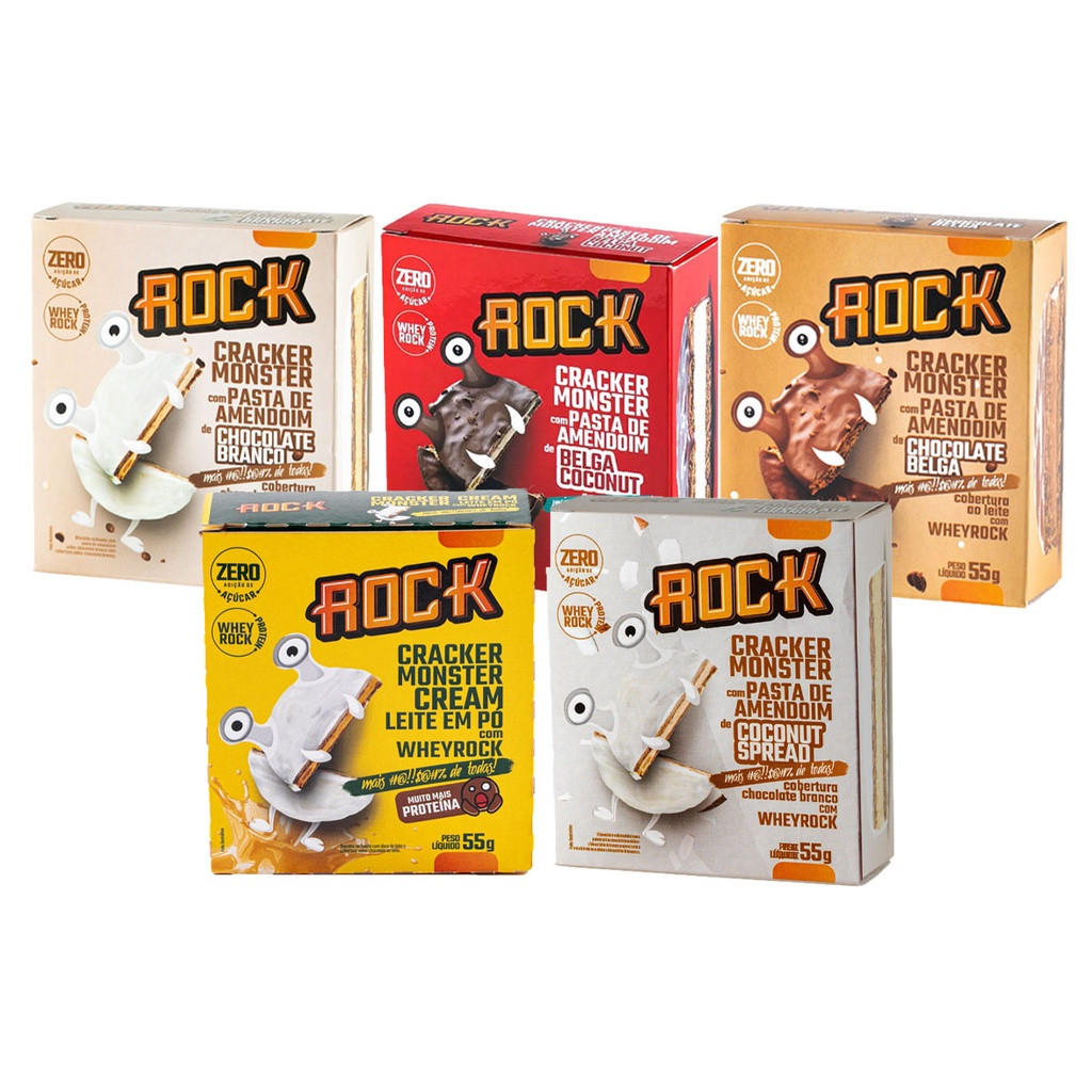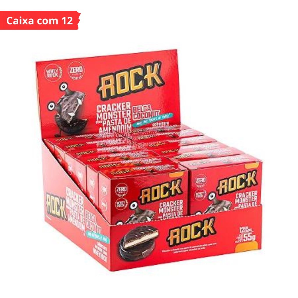 Caixa com 12 Unidades Biscoito Proteico Belga Coconut Prestígi Rock Cracker Monster 55g s/ Açúcar c/ Whey Rock Maravilhoso Alfajor