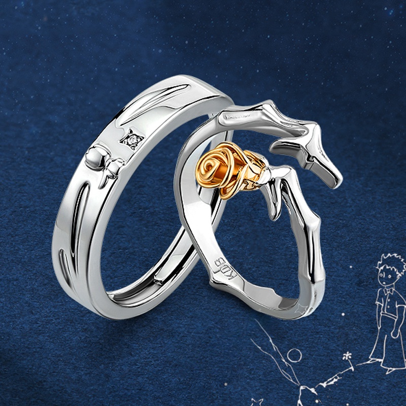 Romântico O Pequeno Príncipe E Rosas Anéis De Casal De Prata Cor Não Desbota Um Par De Pequenos Amantes Frescos Abertura Do Anel Ajustável Para Homens Mulheres