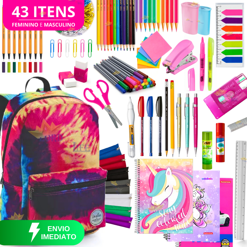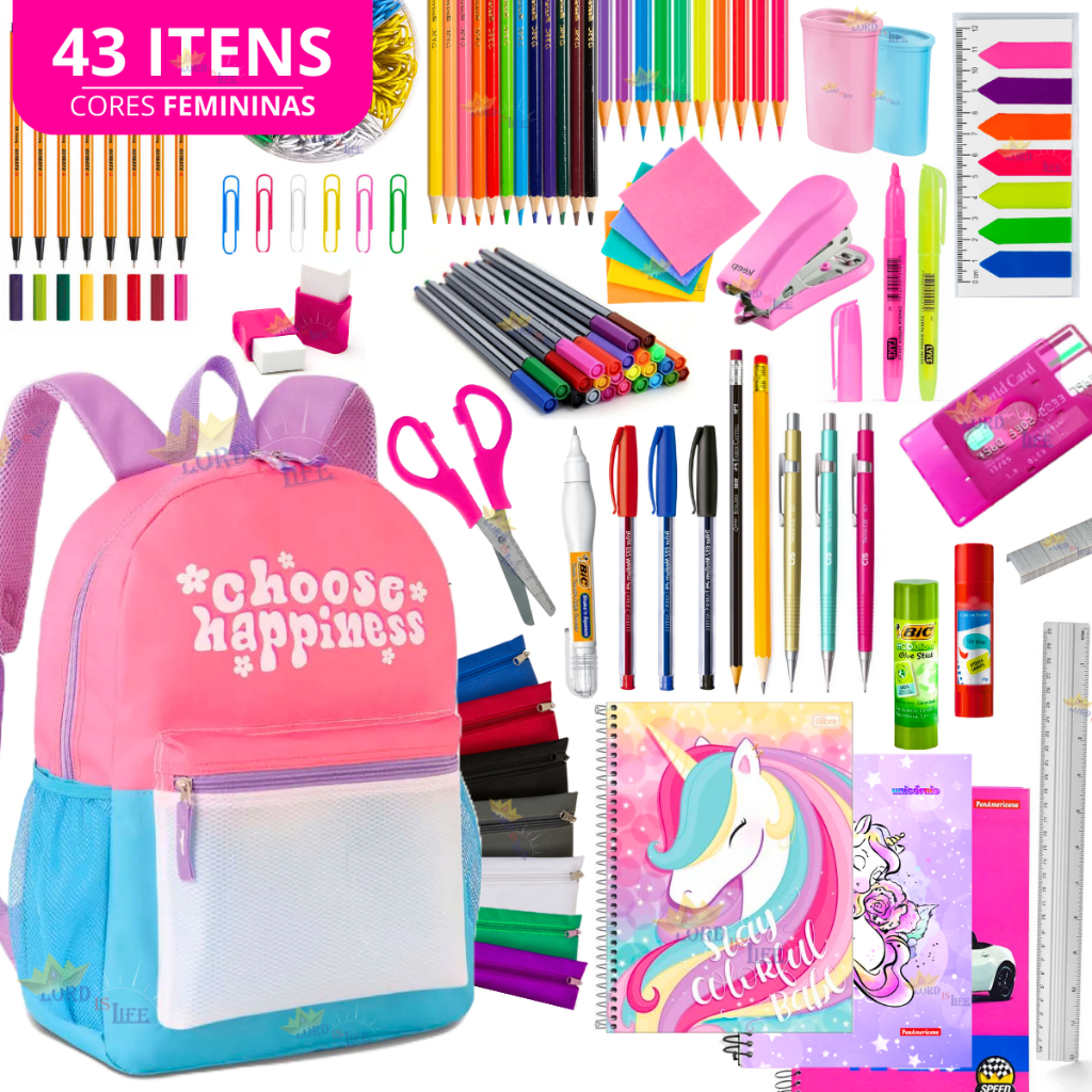 Kit Material Escolar Feminino Completo 43 Itens Volta As Aulas 2024 Menina Mochila Feminina Colorida