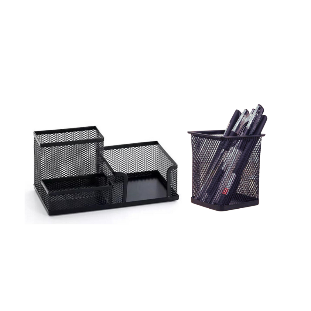 Kit Organizador Mesa Escritório Escrivaninha Metálico Preto Aramado Porta Caneta + Organizador 3 Divisões com Porta Cartão