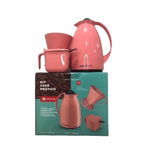 Kit Café Prático Unitermi Garrafa Térmica 650ml + Suporte Para Filtro de Café + Açucareiro Cores Preto Vermelho Rosa Azul
