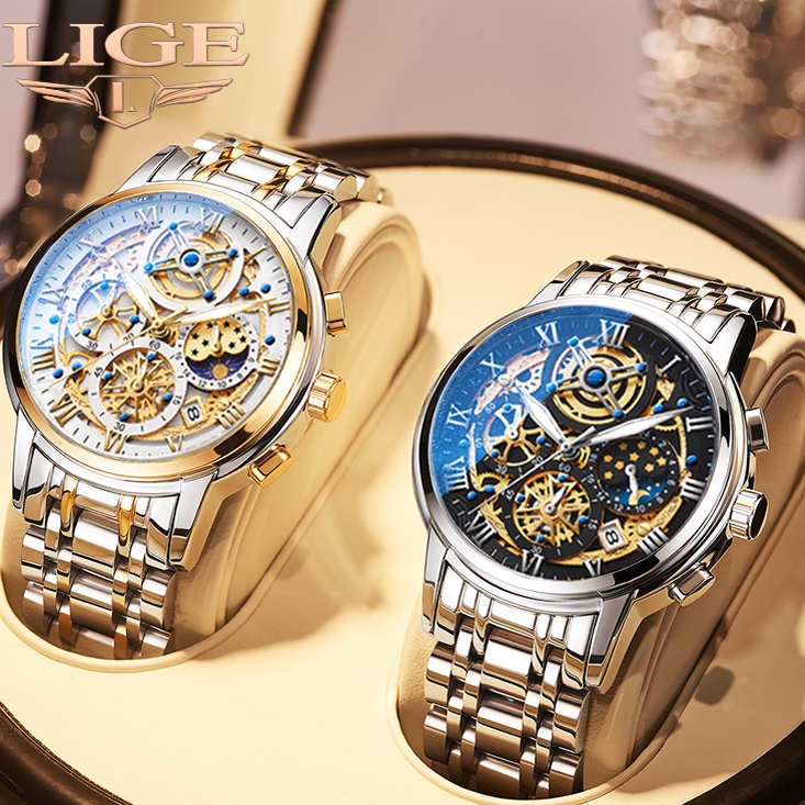 Relogio masculino LIGE Marca Top Relógios de Luxo Casual Aço Inoxidável 24 Horas Fase da Lua Relógio Masculino Esporte Watch Cronógrafo de Quartzo À Prova D' Água + Caixa Original