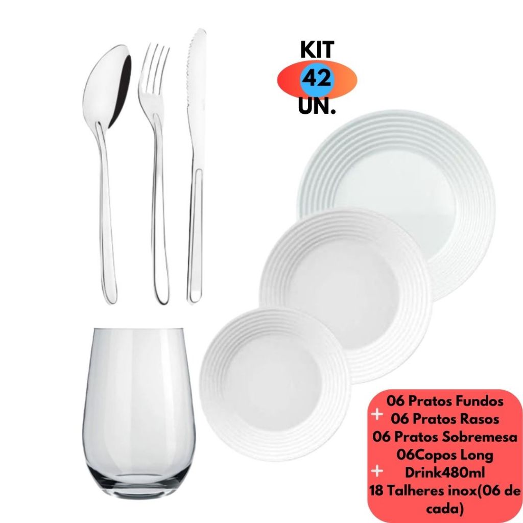 Aparelho de Jantar 42 Peças 18 Prato Vidro 6 Fundos + 6 Raso + 6 Sobremesa Saturno+ 6 Copos + 18 Talheres Inox Oriente Original Garfo Faca Colher Almoço Jogo