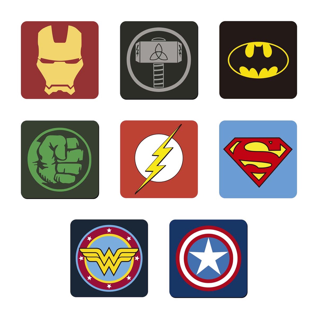 Kit 8 Porta Copos Bolacha Super Heróis Geek Nerd Corte Laser Vingadores Liga Justiça MDF Decoração Mesa Posta Madeira