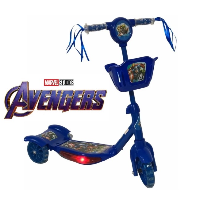 Patinete Infantil Vingadores Azul Menino Avengers Ajustável 3 Rodas Com Cesta Música Luzes + Surpresa