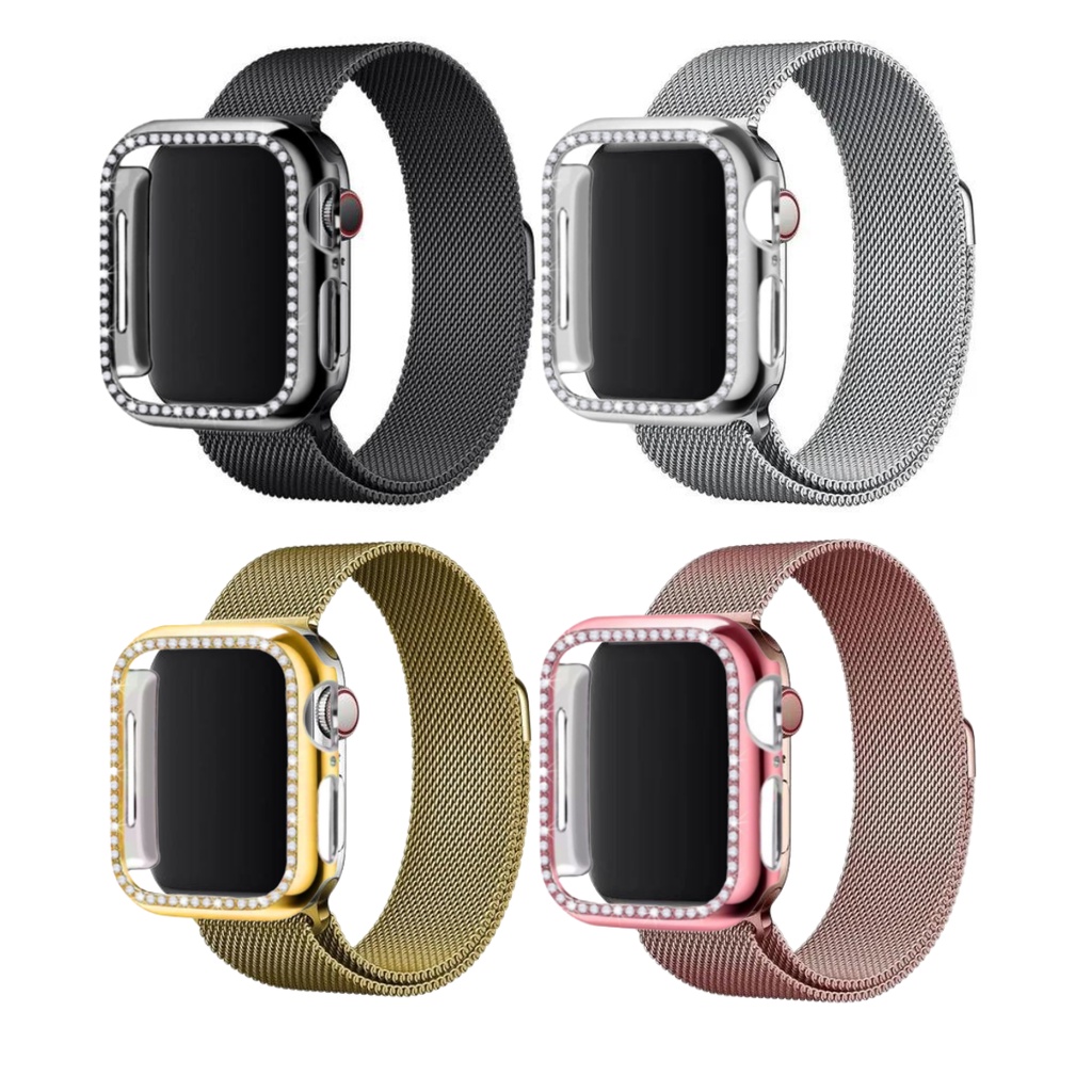 Kit 2 Em 1 Pulseira Loop Aço Milanesa Metal Inoxidável - Case Bumper Strass Luxo Brilhante Premium Proteção Iwo Apple Watch Series 38 40 41 42 44 45mm - Oferta Imperdível