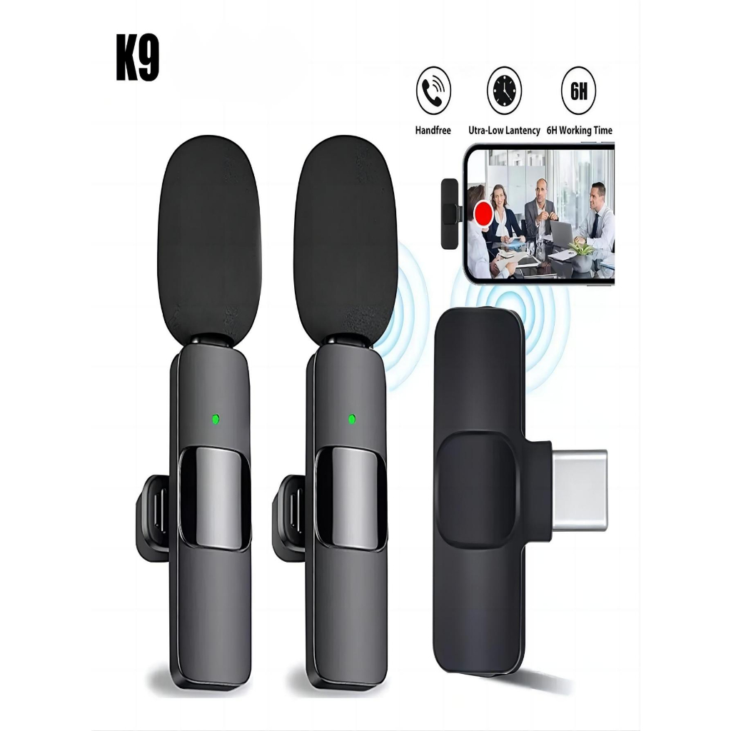 KIT 1/2 Microfone de Lapela Sem Fio K9 Vlog Compatível iPhone e Android Direct Selling