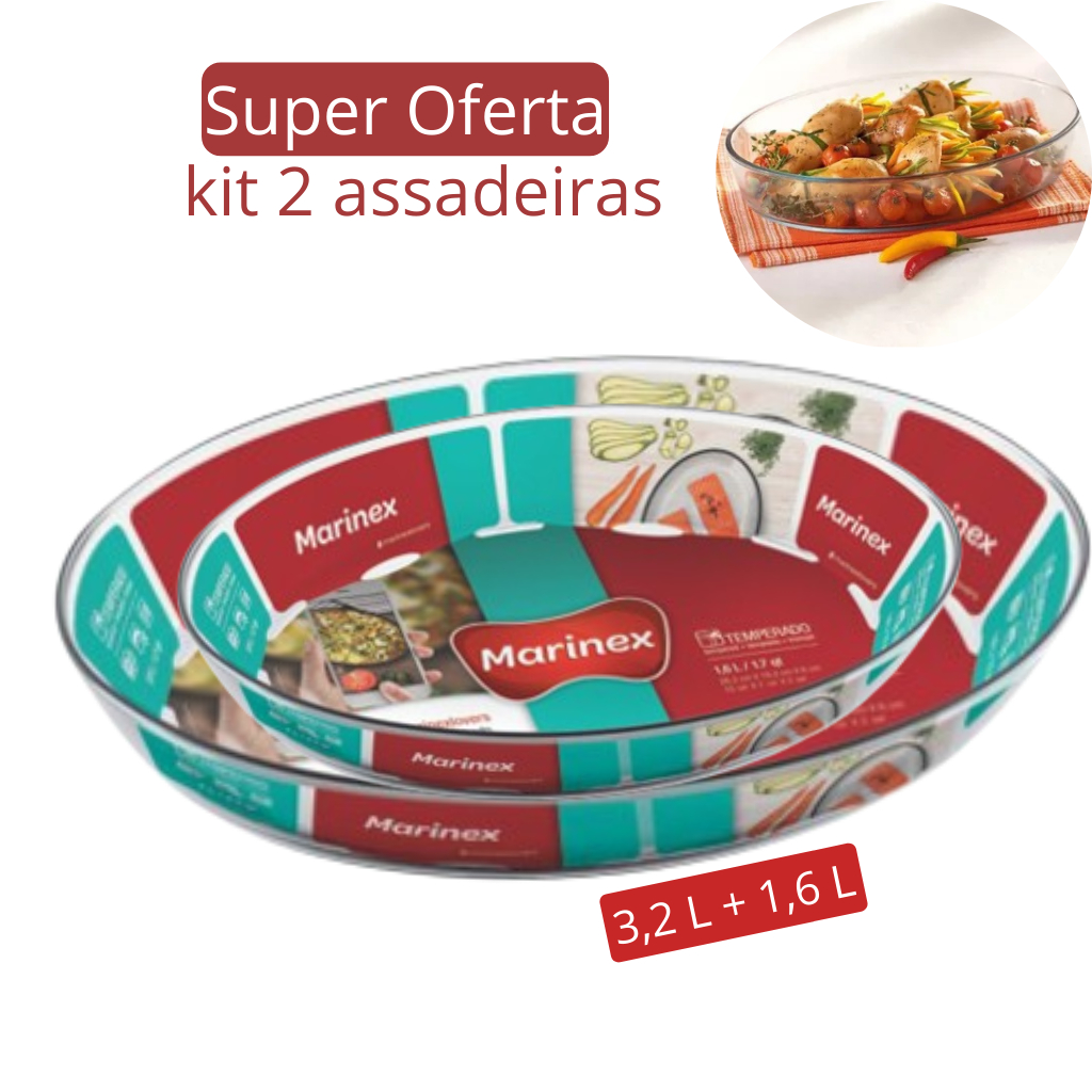 Kit 02 assadeiras Marinex 3,2 Litros 1,6 Litros de vidro travessa oval lasanheira sobremesa