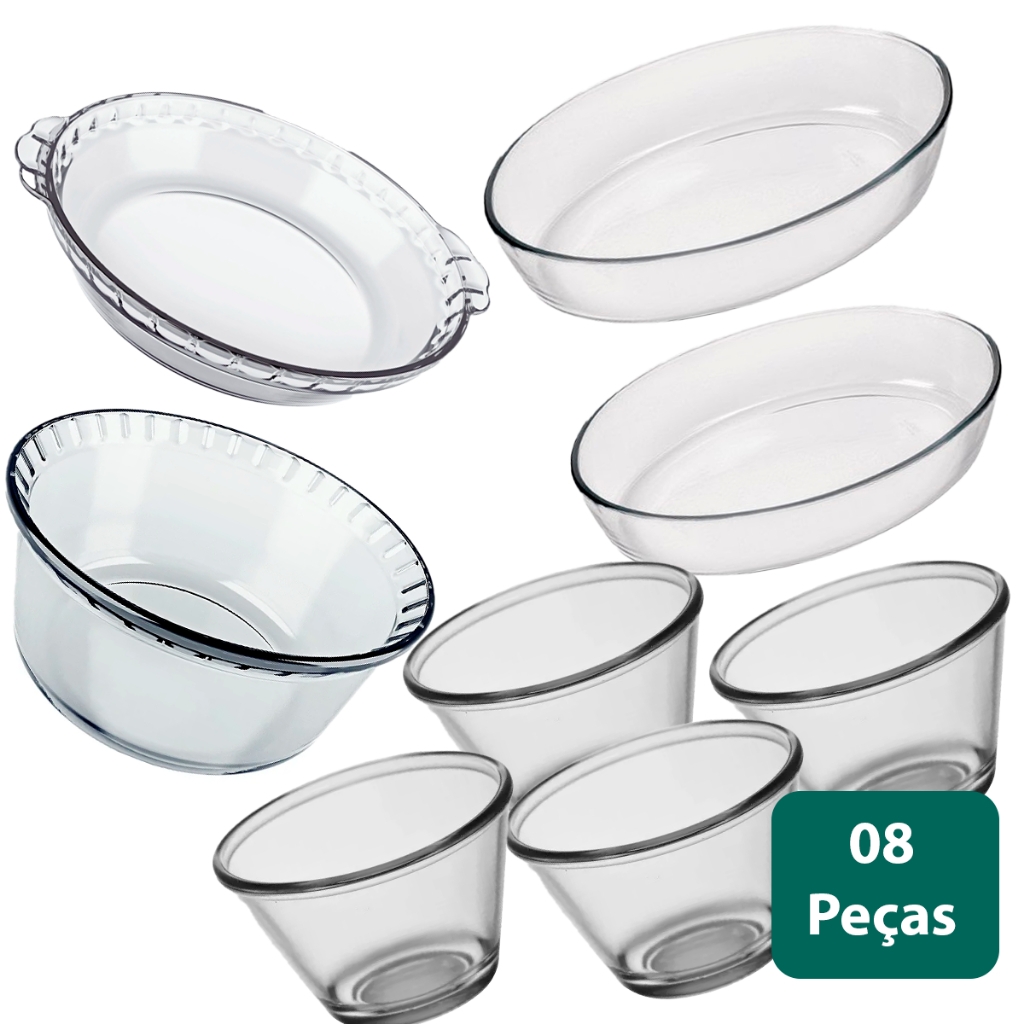 Kit jogo 8 peças de assadeiras lasanheira marinex de vidro temperado com forma filetada 1,3 litros - forma soufle 1,4 litros - tigela Poli - assadeira oval 2,4 litros assadeiras grandes