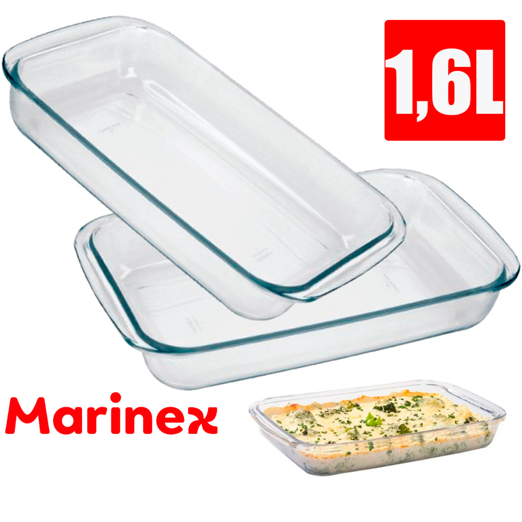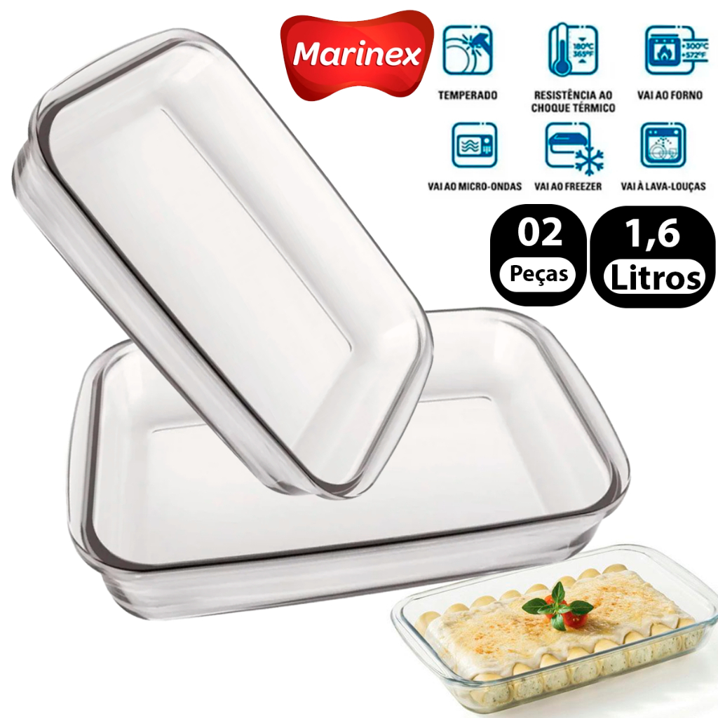 Conjunto Jogo Kit de 2 Travessa 1,6litros Assadeira retângula Lasanheira Refratária de Vidro Marinex