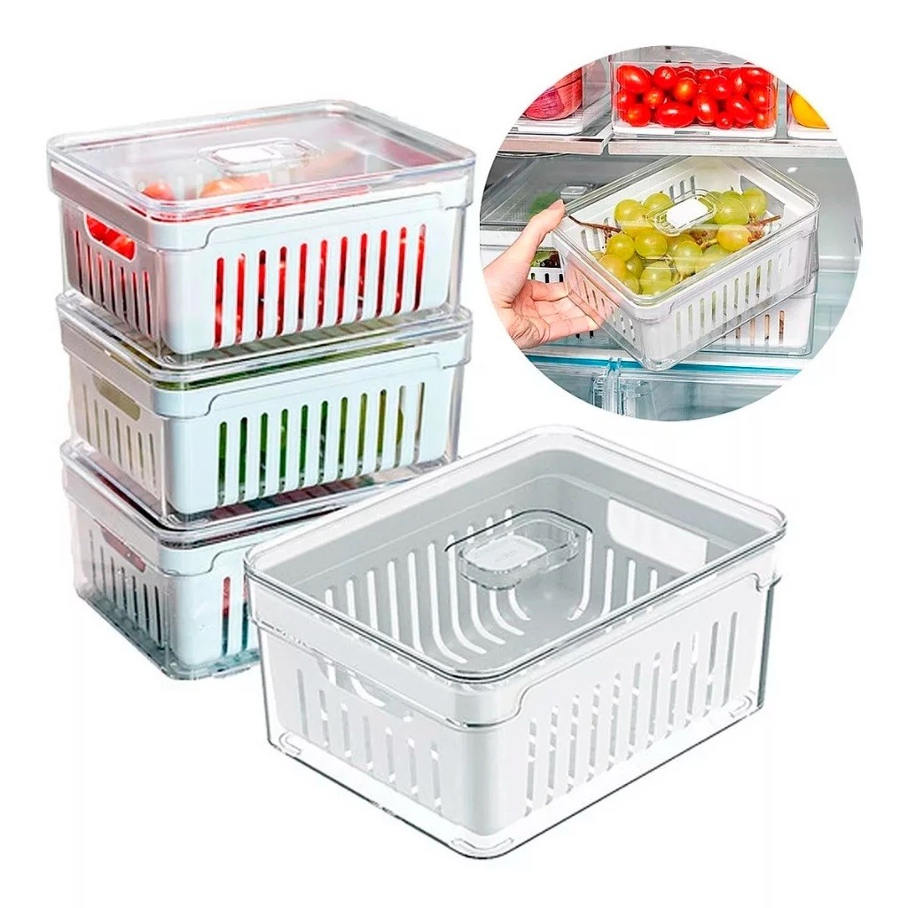 Kit 4 Organizadores Geladeira Acrílico Com Tampa Cesto Drenagem Clear Fresh 2,2L Alimentos Vegetais OU