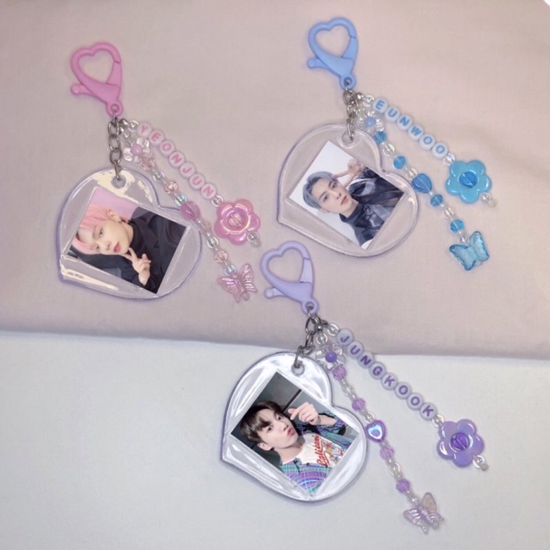 (LEIA A DESCRIÇÃO) chaveiro com foto em acrílico de coração para binder personalizado miçangas (jungkook bts, eunwoo astro, san ateez, taeyong nct, hyunjin stray kids skz, yeonjun txt)