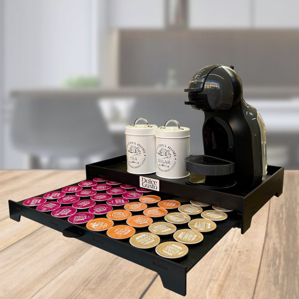 Bandeja Porta 24 Capsulas Preta Gaveta Embutida Decorativo Dolce Gusto Grande Mdf Organizador Apoio Servir Chá Cafeteira