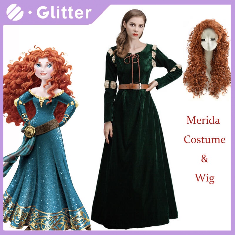 Fantasia Disney Merida Princesa Para Mulheres Adultas Mérida Verde Escuro Maxi Vestido Peruca Festa De Aniversário De Halloween Cosplay Gifts