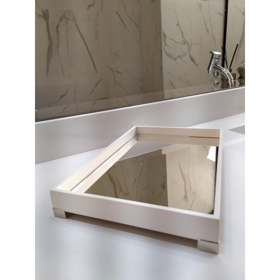Bandeja MDF G Branca B086 Pé Prata Lavabo Cozinha Difusor Quadrado Moderno Banheiro Escritório Espelho Decoração Festa Kit Café