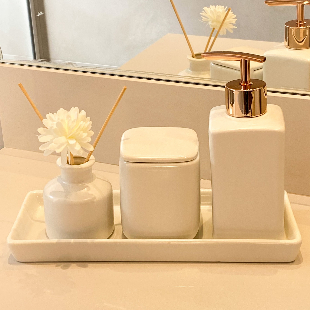Jogo de Banheiro Lavabo Porcelana com Difusor, Dispenser Sabonete Liquido e Bandeja Kit 4 Peças para Decoração