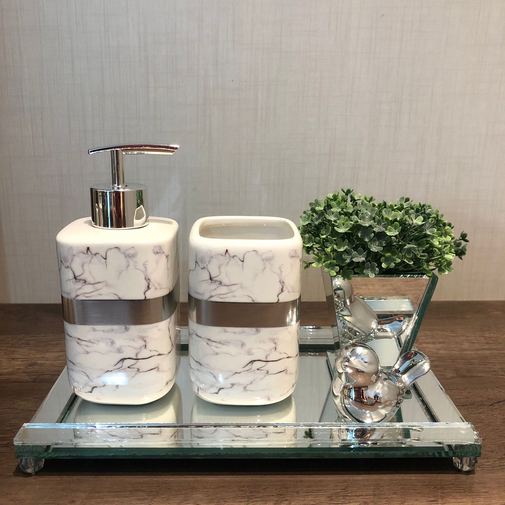 Kit 2 Peças Jogo de Banheiro Lavabo Porcelana 2 Peças Para Decoração Com Dispenser Sabonete Líquido e Porta Escova de Dente