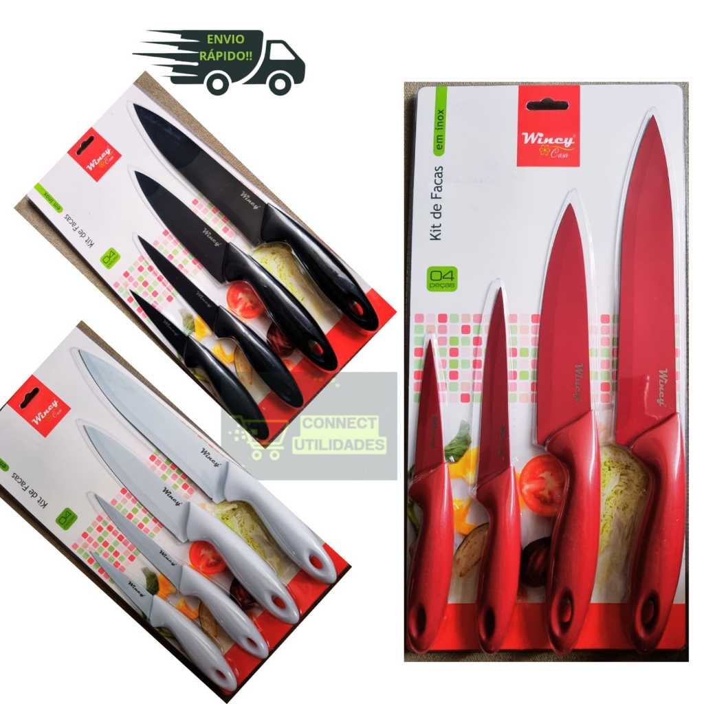 Jogo Kit De Facas Cozinha Aço Inox Kit 4 Peças Azul/Branca/Vermelha e Preto