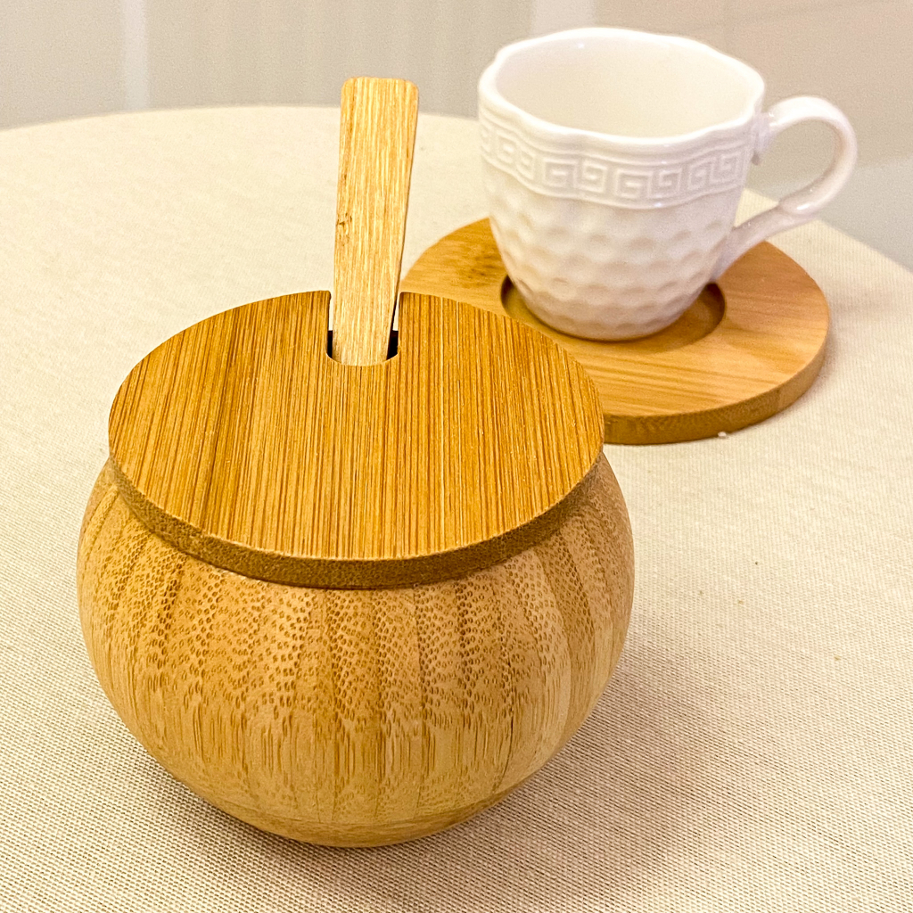 Açucareiro e Saleiro de Bambu com Colher Porta Açucar Sal ou Mantimentos de Cozinha e Decoração para Casa Cozinha Mesa Posta